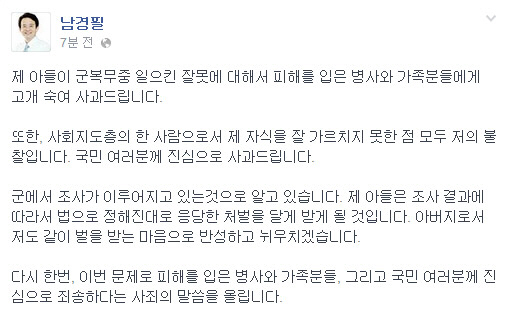 군에서 조사가 이루어지고 있는 것으로 알고 있습니다. 제 아들은 조사 결과에 따라 법으로 정해진대로 응당한 처벌을 달게 받게 될 것입니다. 아버지로서 저도 같이 벌을 받는 마음으로 반성하고 뉘우치겠습니다.