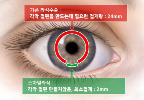스마일라식(릴렉스 스마일)은 각막절편을 생성하지 않고 각막에 2㎜정도의 최소 절개만으로 수술이 진행된다. 이는 기존 라식수술에서의 각막 절개량보다 1/10 정도 적은 양으로 각막 절개량을 최소화함과 동시에 각막신경의 손상도 최소화할 수 있어 안구건조증, 빛 번짐, 원추각막증과 같은 기존 수술법에서 발생할 수 있었던 부작용들의 발생률을 현저히 낮췄다는 통계도 발표됐다.