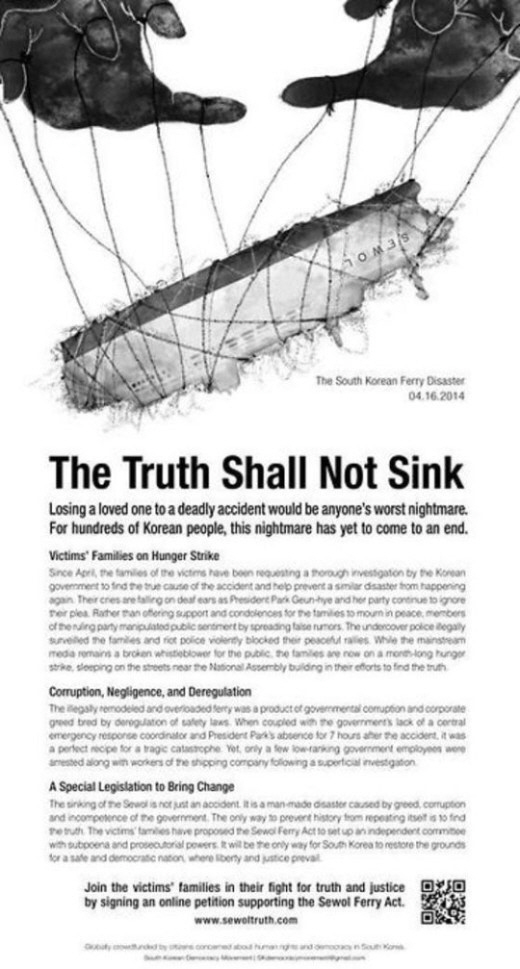 진실은 침몰하지 않는다 뉴욕타임스 광고, 유가족에 도움 됐으면" "
