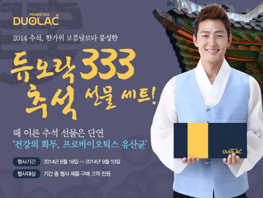 '듀오락 333 추석 선물 프로모션'을 자사 온라인 쇼핑몰인 '듀오락몰(www.duolac.co.kr)'에서 실시한다. 이번 프로모션은 민족 대명절 추석을 앞두고 '듀오락'을 구매하는 고객들에게 특별한 혜택을 부여하고자 기획됐다.