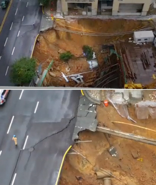 굉음과 함께 도로와 맞닿은 공사장 축대가 무너져 내렸고, 이로 인해 인접한 차도까지 내려앉아 하마터면 큰 화를 부를 뻔 했다. 단 몇 분 만에 깊이 20m, 폭 30m의 위험천만한 낭떠러지가 생겼다.