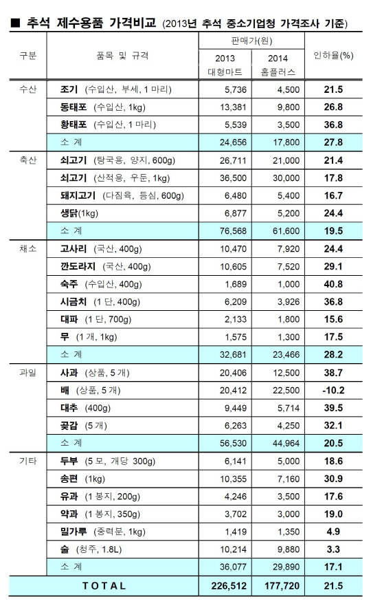가격인하한 23개 제수용품으로 4인 가족 기준 차례상을 차릴 경우 비용은 총 17만7720원으로, 지난해 중소기업청과 소상공인시장진흥공단이 조사한 전국 대형마트 평균 차례상 비용(22만6512원)보다 4만8792원이나 절감할 수 있다. 일부 차이는 있으나 17일 한국농수산식품유통공사(aT)가 전망한 대형유통업체 차례상 비용(27만4753원)보다 10만원가량 저렴한 수준이다.