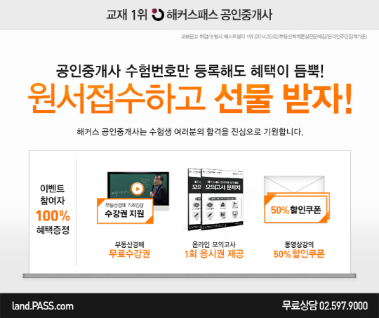 한편, 해커스패스는 공인중개사시험 응시생들의 합격 기원을 위하여 원서접수 이벤트를 27일까지 진행한다. 참여방법은 원서접수 후 발부 받은 수험번호를 해커스패스 공인중개사 사이트(http://eland.pass.com)에서 등록하면 된다. 이벤트 참여자에게 부동산경매 기초 인강 무료 수강권, 온라인 모의고사 1회 응시권, 동영상 강의 50% 할인쿠폰을 증정한다.