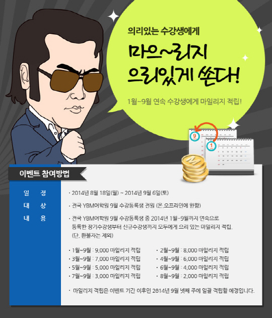 YBM어학원(ybmedu.com)이 9월 수강 등록생 및 장기 수강 등록생을 대상으로 '마'으리'지 적립' 이벤트를 9월 6일까지 실시한다.