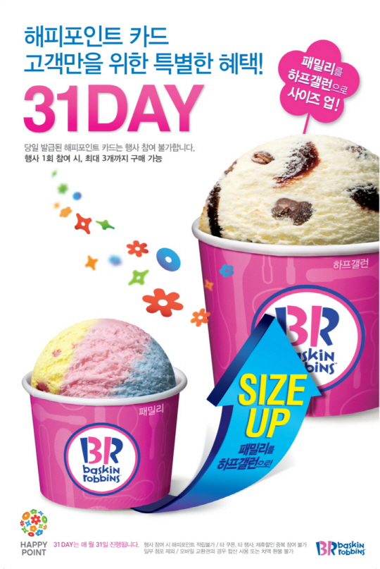 배스킨라빈스(www.baskinrobbins.co.kr)가 매달 31일 패밀리 사이즈 아이스크림 구매 시 하프갤런 사이즈로 업그레이드 혜택을 제공하는 '31DAY' 이벤트도 소비자들 사이에서 꾸준한 인기를 끌고 있다. 배스킨라빈스의 '31DAY'는 5가지 맛을 골라 먹을 수 있는 패밀리 사이즈 아이스크림구매 시 6가지 맛을 선택할 수 있는 하프갤런 사이즈로 업그레이드하여 사이즈 업 혜택을 제공하는 행사로, 패밀리 사이즈 권장소비자가격인 19,500원에 하프갤런 사이즈를 마음껏 즐길 수 있다. (하프갤런 사이즈 권장소비자가격 23,500원)