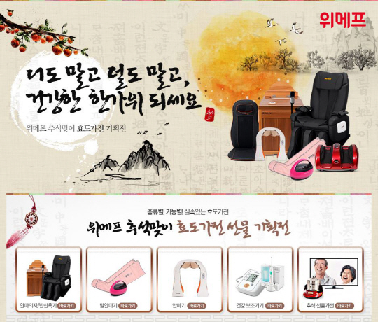 소셜커머스 위메프(대표 박은상 www.wemakeprice.com) 가 민족대명절 추석을 맞아 25일부터 효도가전 기획전을 개최한다.