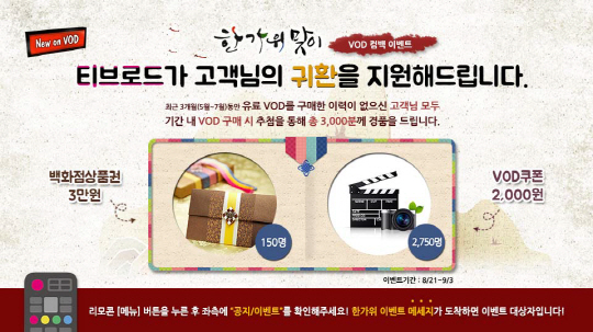 티브로드 디지털케이블TV에 가입한 뒤 유료 VOD를 이용한 적이 있지만 5월 1일부터 7월 31일까지 3개월 동안 VOD를 한번도 구매한 적이 없는 고객을 대상으로 2주 동안 티브로드 VOD에 컴백할 경우 자동 응모와 추첨을 통해 한가위 맞이 감사의 선물을 쏜다.