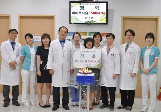 강남베드로병원 하이푸클리닉센터가 20일 자궁근종 하이푸 시술 1400례에 이어 1500례를 수립해 국내 최다 기록을 재 경신했다. 이는 지난 2011년 11월 미국, 일본, 한국 등 세계 특허를 보유한 Haifu Kinfe를 도입해 첫 하이푸시술을 시행한 이래 2년 9개월 만에 일궈낸 값진 성과이다.