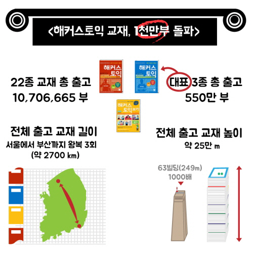 이 가운데 가장 많이 팔린 '해커스 토익 리딩'과 '해커스 토익 리스닝', '해커스 토익 보카' 등 3종 교재는 총 550만부 출간됐다. 9년간 출간된 해커스토익 교재 22종 약 1,000만부를 일렬로 연결했을 때의 길이는 약 2,700km로 서울~부산(약 400km)을 3번 이상 왕복할 수 있는 거리이다. 또 교재를 쌓았을 경우 전체 높이는 약 25만m로 63빌딩(높이 249m)의 1,000배에 달한다. 해커스 토익의 대표 3종 교재 외에 초급자용 '해커스 토익 스타트' 시리즈, 토익 실전문제집인 '해커스 토익 실전 1000제 1, 2', '해커스 토익 예상강의 문제집 1, 2' 등 총 22종을 판매하고 있다.