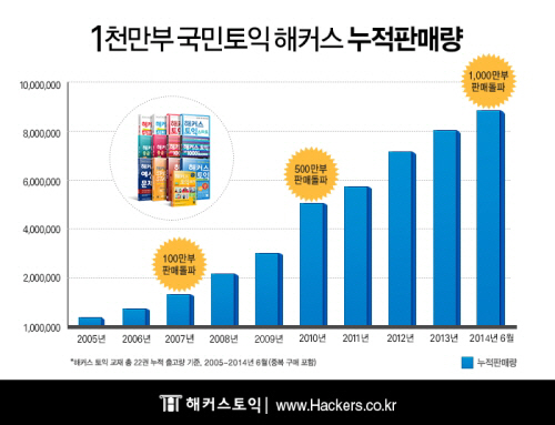 단일 브랜드의 영어교재로 1960년대부터 판매된 '성문종합영어' (발매당시는 '정통종합영어)에 버금가는 기록이다. '종합영어' 시리즈가 1967년 이후 40년 이상 누적 판매 실적인데 비해 2005년 1월 '해커스 토익 리딩'과 '해커스 토익 리스닝'으로 첫선을 보인 해커스 교재는 9년만에 1,000만부를 넘어섰다. 2005년 이후 토익시험 응시자는 약 1,700만명으로, 응시자 두명 가운데 한명 이상은 해커스 교재로 공부한 셈이어서 수험생들 사이에서 '국민 토익'으로 불리고 있다.