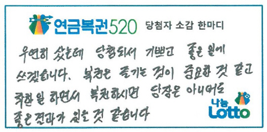 또한 "1등 복권 앞뒤로 2등이 있어 연번으로 구매시 1, 2등에 동시 당첨되는 연금복권의 특성상 평소 조별로 1장씩 구입하는 습관 때문에 2등 당첨 기회를 놓쳤다"고 아쉬워하며 "주변 사람들에게 연금복권은 조별로 구입하고 꼭 연번으로 구매하길 추천한다"고 덧붙였다.