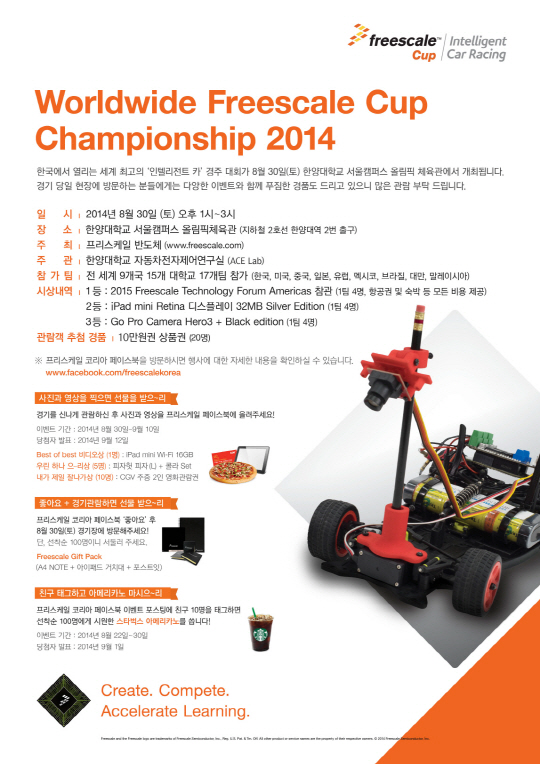 자동차 반도체 분야 업체 프리스케일 반도체(NYSE:FSL, www.freescale.com 한국 지사장 황연호)는 오는 30일 '인텔리전트 카(Intelligent Car, 지능형 모형차)' 경주 대회의 최종 결선인 '월드와이드 프리스케일 컵 챔피언십(Worldwide Freescale Cup Championship)'을 한국에서 개최한다고 21일 밝혔다.