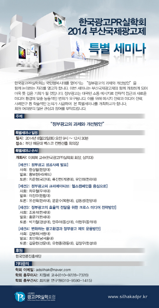 한국언론진흥재단(이사장 김병호) 후원으로 열리는 이번 특별 세미나는 세계적인 국제광고제로 자리매김한 '2014 부산국제광고제'에서 학회가 참여하는 유일한 학술세미나로, '2014 부산국제광고제'를 더욱 풍성하게 꾸며줄 것으로 기대된다.