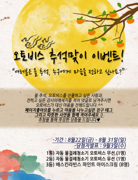 오토비스의 최태웅 대표는 "상반기 오토비스를 사랑해주신 많은 소비자분들께 보답의 마음으로 이번 이벤트를 준비했다"며 "즐거운 이벤트와 기분 좋은 오토비스 선물, 그리고 정겨운 가족들과 함께 풍성한 한가위가 되기를 바란다"고 전했다.