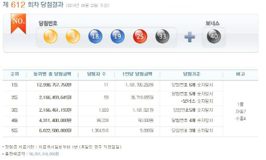 제612회 로또복권을 추첨한 결과 '6, 9, 18, 19, 25, 33' 등 6개가 1등 당첨번호로 뽑혔다. 2등 보너스 번호는 '40'다.