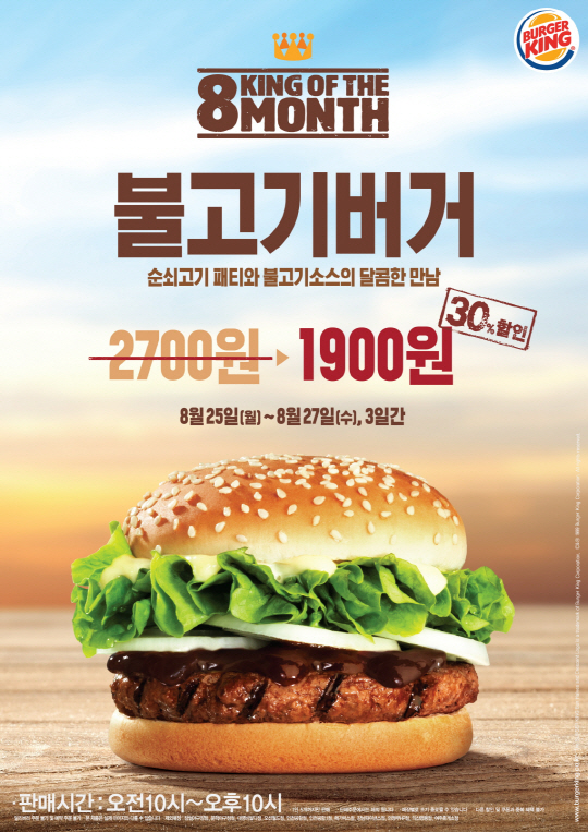 버거킹이 25일부터 27일까지 3일간 '불고기버거' 단품(정가 2700원)을 30% 할인된 1900원에 판매하는 8월의 'KING OF THE MONTH' 프로모션을 진행한다.