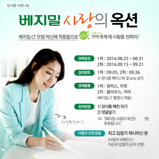 '베지밀 사랑의 옥션' 이벤트는 정식품이 자사의 SNS를 통해 박신혜가 광고촬영에 착용한 의상을 경매에 부치고 수익금 전액을 기부하는 따뜻한 자선 이벤트다. 이벤트는 정식품 공식 페이스북(facebook.com/vegemilgood)에서 누구나 참여 가능하며, 댓글로 낙찰가를 제시하고 최고 가격을 제시한 참가자에게 의상이 낙찰되는 방식으로 진행된다. 최종 낙찰된 고객은 박신혜의 광고 촬영 의상 및 친필 사인지 소장과 함께 박신혜와 자신의 이름으로 국제구호 NGO 단체인 '기아대책'에 낙찰 금액을 기부하는 뜻 깊은 일에 동참할 수 있다.