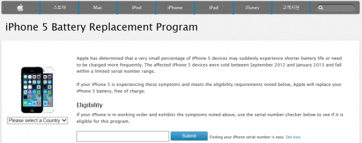 아이폰5 배터리 교환 프로그램'에 단말기 시리얼 번호를 입력하면 교환 대상 여부를 확인할 수 있다.