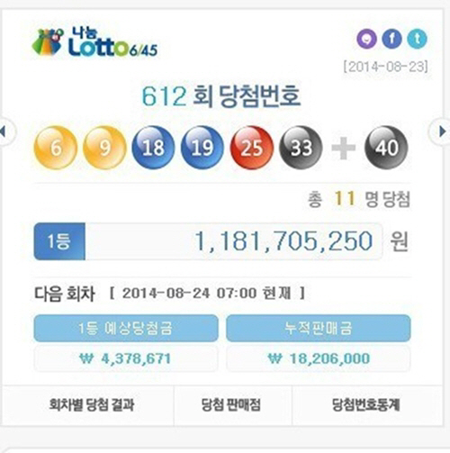 5개 번호와 보너스번호 40을 맞춘 2등은 3671만 9655만 원씩을 받는다. 3등은 118만 1921원을 받는다.