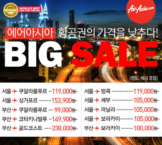 25일부터 31일까지 진행되는 이번 빅 세일은 2015년 3월 1일부터 10월 24일까지 출발하는 모든 항공편이 해당된다.