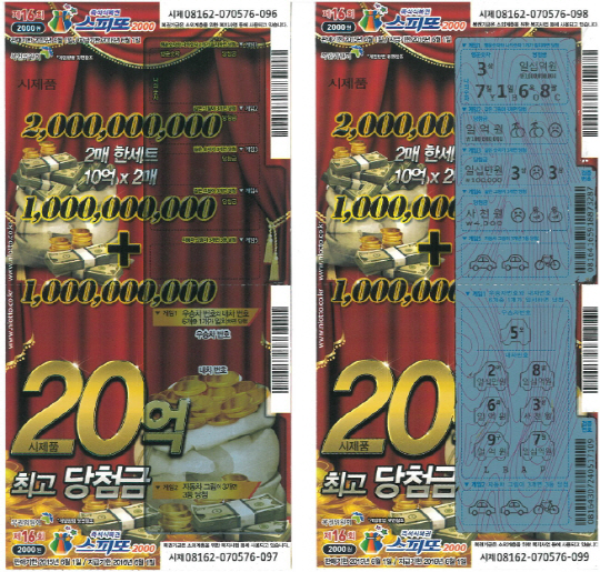 현장에서 바로 20억원의 당첨여부를 확인할 수 있는 즉석복권 '스피또2000'이다. 나눔로또에 따르면 이 복권은 동전으로 긁어서 당첨번호를 확인하는 스크래치 방식으로, 1등 복권 4매를 무작위로 발매했던 기존과 달리 2매를 한 세트로 만들어 당첨금을 20억원으로 늘렸다.