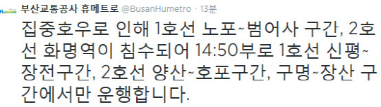 부산 지하철 운행 중단, 비 피해 조심하세요"등의 다양한 반응을 보이고 있다. <스포츠조선닷컴>