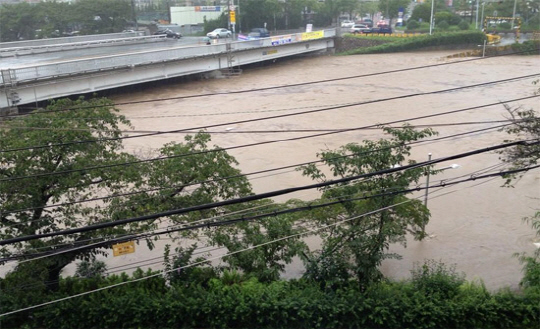 특히 금정산을 낀 금정구에는 오후 1시부터 시간당 100㎜의 집중호우가 내리면서 오후 2시 현재 153.5㎜의 강수량을 기록했다.
