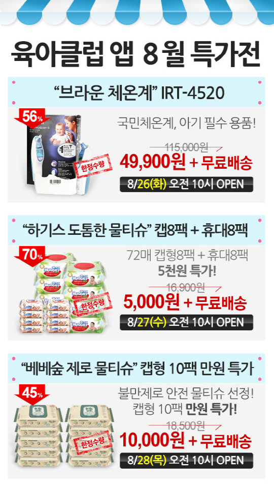 육아클럽 앱은 8월 26일부터 해당 상품을 시중가인 11만5000원에서 56% 할인된 49,900원의 파격가에 판매한다. 또한 육아맘들의 필수 소모품인 물티슈 또한 시중가 대비 70% 할인된 초특가에 제공한다. 1만6900원의 하기스 도톰한 물티슈는 5000원, 1만8500원의 베베숲 제로 물티슈 10팩은 1만원에 판매된다.