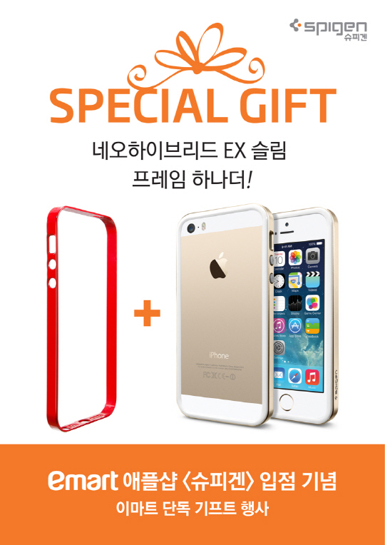 슈피겐은 '이마트 애플샵' 입점을 기념한 이벤트도 실시한다. '이마트 애플샵'을 통해 슈피겐의 대표적인 베스트셀러 케이스인 '아이폰5/5s용 네오하이브리드 EX'를 구매 시 겉면의 프레임을 추가로 하나 더 증정한다. 이번 행사는 제품 소진 시까지 전국 '이마트 애플샵'에서 진행된다.