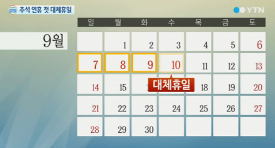 올해는 추석 연휴 첫 날인 9월 7일이 일요일과 겹쳐 연휴 끝 다음날인 10일까지 휴일이다.