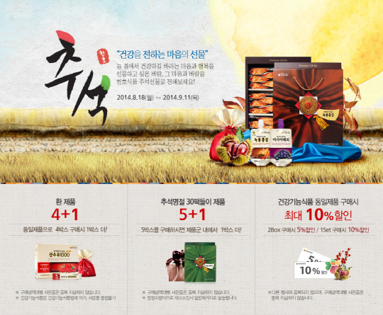 천호의 추석선물용 제품은 귀하신 분을 한 분 더 챙기시라고 5박스 구매 시 1박스를 더 증정하는 '5+1 프로모션'을 진행한다. 특별 구성된 명절 선물 외에도 환 제품은 4+1, 건강기능식품의 경우 1세트(3박스) 구매 시 10% 할인 된 가격에 만날 수 있다. 추석을 맞아 정상가보다 할인된 가격에 구입할 수 있는 셈이다.