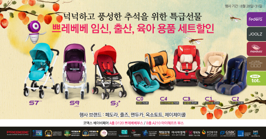유아용품전문업체 쁘레베베(www.prebebe.co.kr, 대표 정세훈)가 제26회 베이비페어에 참가해 추석맞이 페도라(Fedora) 유모차, 카시트 등을 할인가에 선보인다.