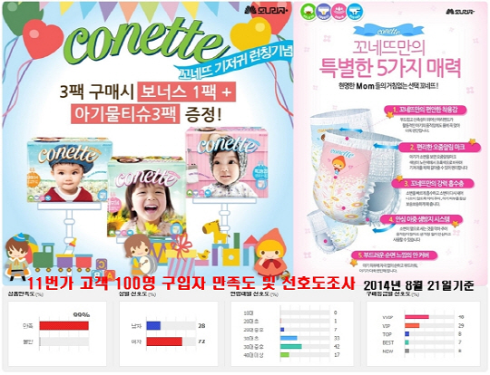 한편, 꼬네뜨는 지난 21일 11번가 고객설문조사를 진행한 결과 꼬네뜨 기저귀의 경우 고객구입 만족도가 100명 기준 99% 수준이다. 또한 여성 위주의 30대 중후반 고객이 가장 많이 구입하는 것으로 집계되고 있다.