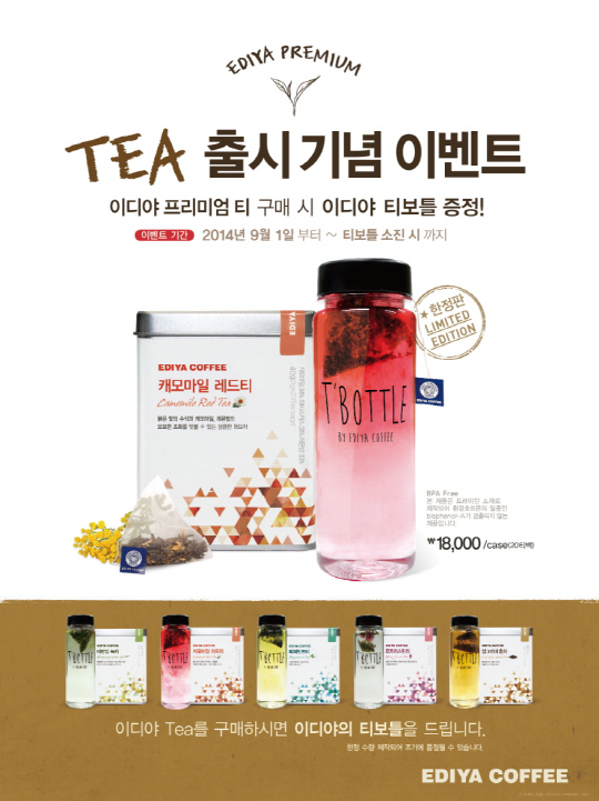 이디야커피는 이번 프리미엄 티 리뉴얼 출시를 기념해 제품을 구매하는 소비자를 대상으로 한정판 티보틀 증정 이벤트를 진행한다. 내달 1일부터 한정판 티보틀이 소진될 때까지 프리미엄 티 구입 고객에게 선착순으로 증정 할 예정이다.