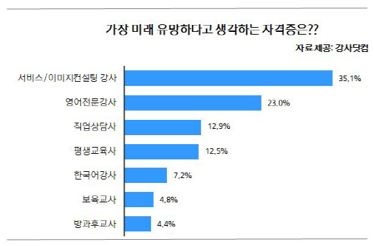 2위인 '영어전문강사'는 23%의 지지를 얻었으며, '직업상담사'가 12.9%, '평생교육사'가 12.5%로 나란히 뒤를 이었다. '한국어강사'(7.2%), '보육교사'(4.8%), '방과후교사'(4.4%)는 5~7위를 기록했다.
