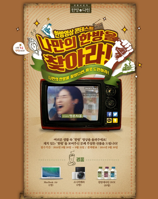 참여를 원하는 소비자는 각 제품 콘셉트에 어울리는 나만의 생활 속 '한방' 영상 제작해 유튜브 업로드 후 이벤트사이트(http://hanbangevent.com)를 통해 응모하면 된다. 당첨 결과는 9월30일 해당 이벤트 페이지를 통해 공지할 예정이다.