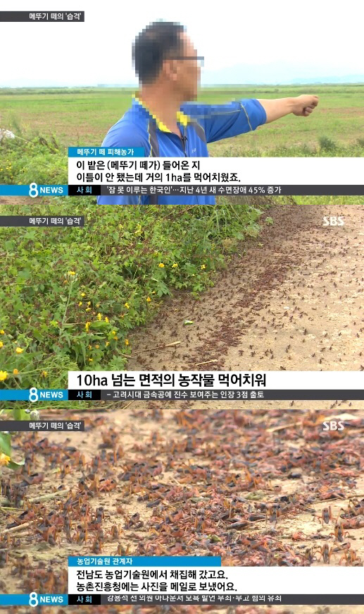 메뚜기떼는 간척지에서 마을 앞 농지 쪽으로 이동하고 있으며, 벼와 기장 등 농작물의 피해가 늘어나고 있는 것으로 알려졌다.