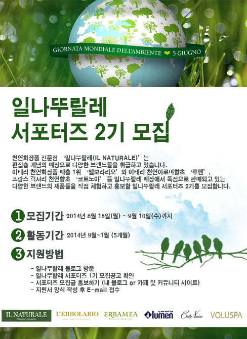 뷰티, 천연화장품, 천연 아로마향초 등에 관심이 많은 사람은 누구나 신청이 가능하며, 블로그와 페이스북 등 소셜 네트워크 활동을 활발하게 하는 사람에게 유리하다. 참여 신청은 9월 10일까지 일 나뚜랄레 공식블로그(blog.naver.com/ilnaturale)에서 모집 공고를 확인 한 후 개인 블로그에 모집글을 포스팅 한 뒤 지원서를 작성해 신청메일로 접수하면 된다.