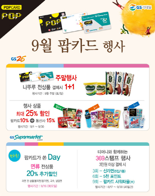GS25는 9월 한 달 동안 550여 개의 상품에 대하여 덤 증정, 2+1, 1+1 행사를 진행하며 해당 행사 상품들을 팝카드로 구매하는 고객에게는 10% 추가 할인 혜택을 준다.