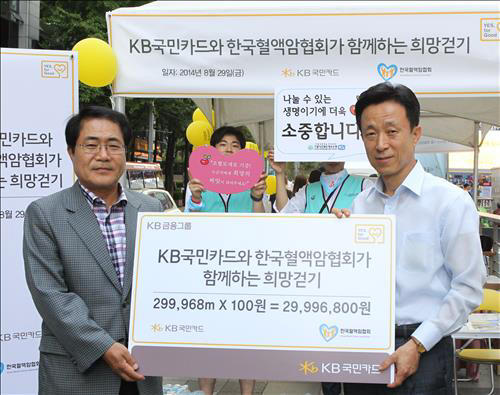KB국민카드는 이날 행사 종료 후 참여 임직원 수와 이동한 거리에 비례해 조성한 기부금 2천900만원을 한국혈액암협회에 전달했으며, 전달된 기부금은 혈액암 환자들의 치료를 위해 쓰일 예정이다.
