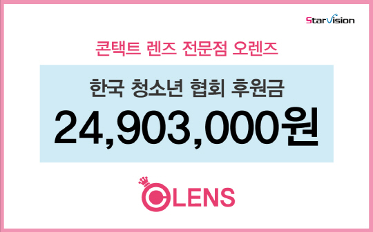 미용콘택트렌즈 전문업체 (주)스타비젼 오렌즈(대표이사 박상진)가 지난 20일 한국청소년 협회에 2490만3000원을 전달했다.
