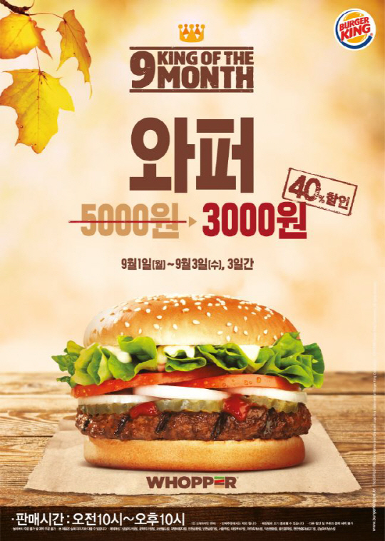 이번 프로모션은 버거킹 전국 매장에서 9월 1일 오전 10시부터 9월 3일 오후 10시까지 진행된다. (단, 일부 매장은 행사에서 제외).
