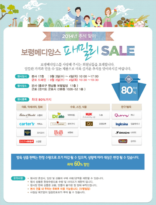 이번 패밀리세일은 온 가족이 함께 모이는 추석을 맞아, 아이 및 조카 선물로 고민하는 분들에게 완구제품을 비롯한 다양한 육아용품을 알뜰하게 구매할 수 있는 기회를 제공하고자 기획됐다. 보령메디앙스의 유아복 브랜드 타티네 쇼콜라를 비롯해 유키두와 스킵합, 브이텍 등 다양한 완구브랜드 등을 최대 80% 할인된 가격으로 판매한다. 다이치, 브라이택스, 멕시코시, 퀴니, 잉글레시아 등 유명 카시트와 유모차 제품들도 50~60% 할인 판매한다. 이와 함께 비앤비와 더 퓨어, 닥터아토와 ONO2 베이비오 등 보령메디앙스의 생활용품과 스킨케어, 식품들도 최대 80%까지 할인 판매한다.