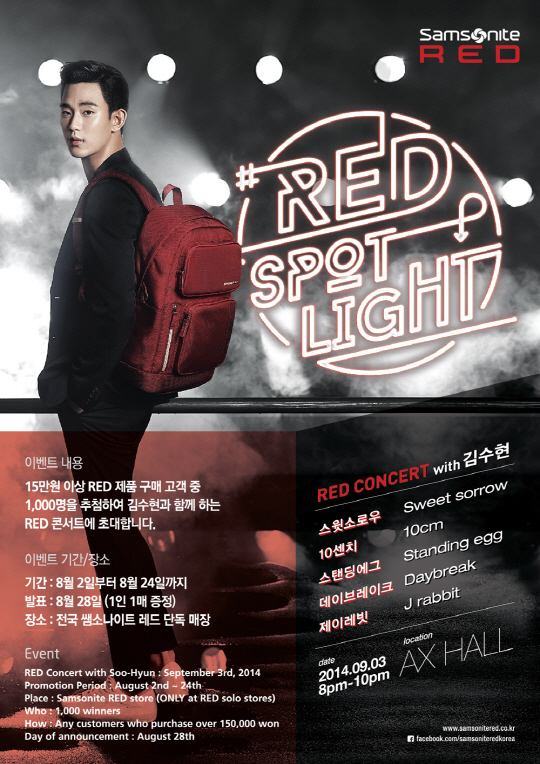 감각적이면서 세련된 캐주얼 가방 브랜드 쌤소나이트 레드가 주최하고 최근 20대에게 가장 인기있는 뮤지션들이 출연하는 '레드 스포트라이트' 콘서트. 한류스타이자 쌤소나이트 레드의 글로벌 모델인 김수현과 함께 스윗소로우, 10cm, 스탠딩에그, 데이브레이크, 제이레빗 총 5팀이 출연하며, 음악 토크 이벤트 등 다채롭게 꾸며질 예정이다.