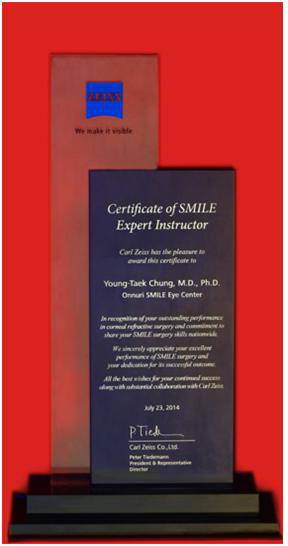 독일 칼자이스는 스마일수술의 안정성, 정확성 등 의사의 전문기술 검증을 통해 결정하게 된다. 이번 인증은 칼자이스㈜ 본사에서 피터티데만 대표를 비롯한 관계자들이 참석해 화제가 된 바 있다.