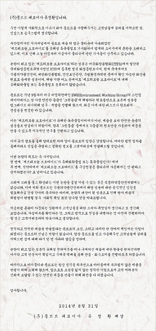 몽드드는 31일 홈페이지에 올린 공지를 통해 일부 언론에서 유해성 논란을 제기한 '세트리모늄 브로마이드' 성분에 대해 "유해 화학 물질로 분류되지 않은 성분"이라고 반박했다.