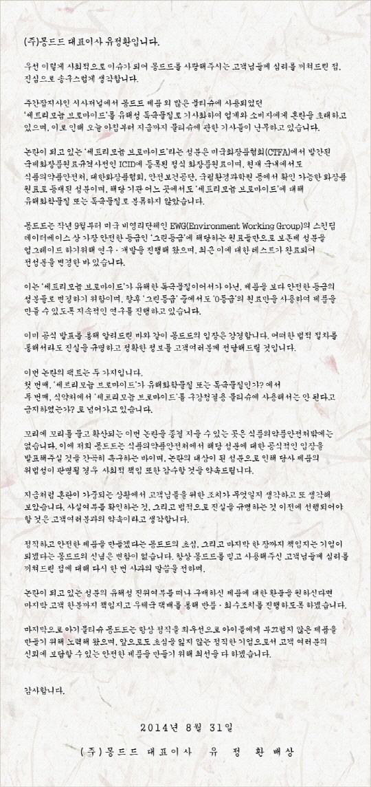 유정환 몽드드 대표이사는 지난달 31일 자사 홈페이지를 통해 "논란이 되는 세트리모늄 브로마이드라는 성분은 미국화장품협회에서 발간된 국제 화장품 원료 규격 사전인 ICID에 등록된 정식 화장품 원료"라고 해명했다.