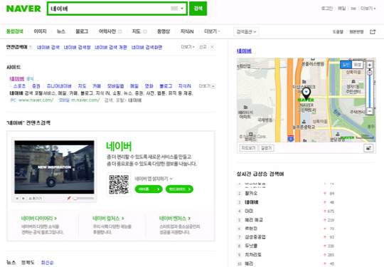 오른쪽 상단의 실시간 급상승 검색어를 하향 배치하고, '지도' '동영상', '이미지', '다시 보는 화제의 뉴스' 등으로 편의성 있는 서비스를 제공했다.
