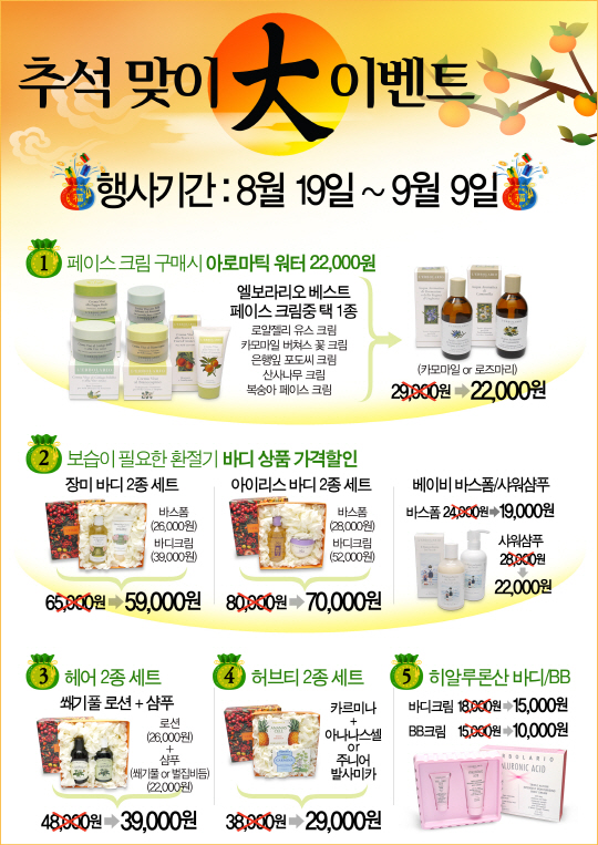추석선물 세트는 바스폼과 바디크림으로 구성된 바디세트 3종(장미 바디세트, 아이리스 바디세트, 베이비 바디세트)과 헤어로션, 샴푸로 구성된 쐐기풀 헤어 2종 세트, 유기농 원료를 사용해 만들어진 허브티 2종 세트, 히알루론산 바디/BB세트 등이다. 선물세트는 기존 제품 가격보다 10~25% 할인된 가격으로 판매한다. 또한 엘보라리오의 베스트셀러 페이스 크림(로얄젤리 유스크림, 카모마일 버쳐스 꽃 크림, 은행잎 포도씨 크림, 산사나무 크림, 복숭아 페이스 크림) 구매 시 아로마틱워터를 기존 가격인 2만9000원에서 2만2000원으로 할인 판매한다.