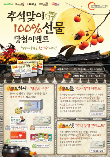 2일 오리엔탈푸드코리아에 따르면 통큰 추석맞이 이벤트는 지난달 30일부터 3가지 형태로 진행 중이다. 대표적인 것은 '행운의 쿠폰'이다. 식사를 한 고객들에게 스크래치 복권(1테이블 당 1매)을 증정한 뒤, 스크래치 복권을 긁었을 때 나오는 상품을 제공한다. 1등 백화점상품권 30만원(1명), 2등 대명리조트 패키지-콘도 및 리프트 이용권(2명), 3등 오리엔탈푸드코리아 식사권(30명), 4등 영화예매권 2매(50명), 5등 액정클리너 스티커 등을 제공하고 있다.